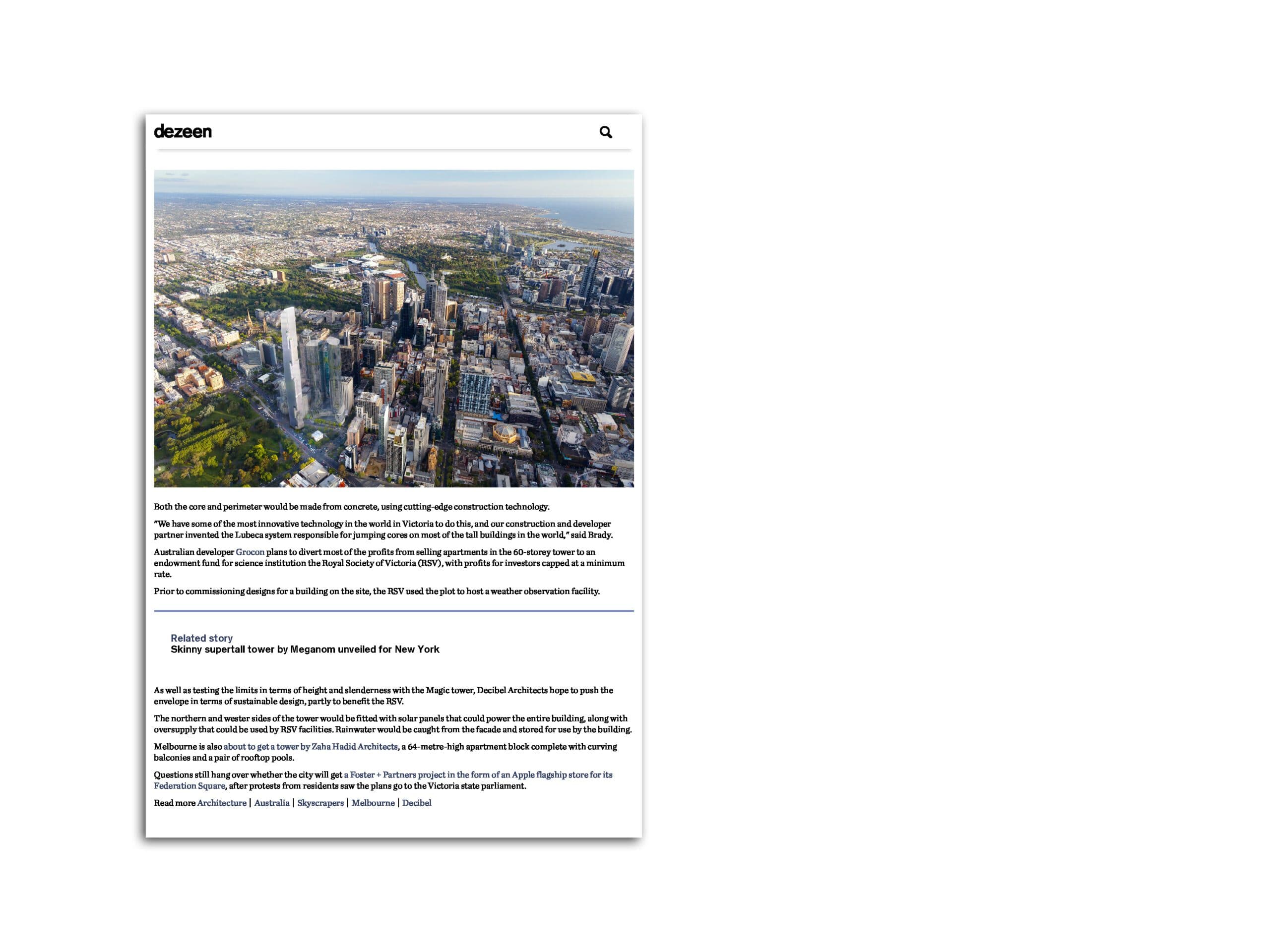 Decibel Architecture has revealed its design for what could become Melbourne’s tallest skyscraper, a skinny 330-metre-high tower rising from a triangular plot. Proposed for an angled plot just half the size of a tennis court, the Magic tower would be the tallest building in the city, outstripping the 297.3-metre Eureka tower… As well as testing the limits in terms of height and slenderness with the Magic tower, Decibel Architects hope to push the envelope in terms of sustainable design, partly to benefit the RSV.”