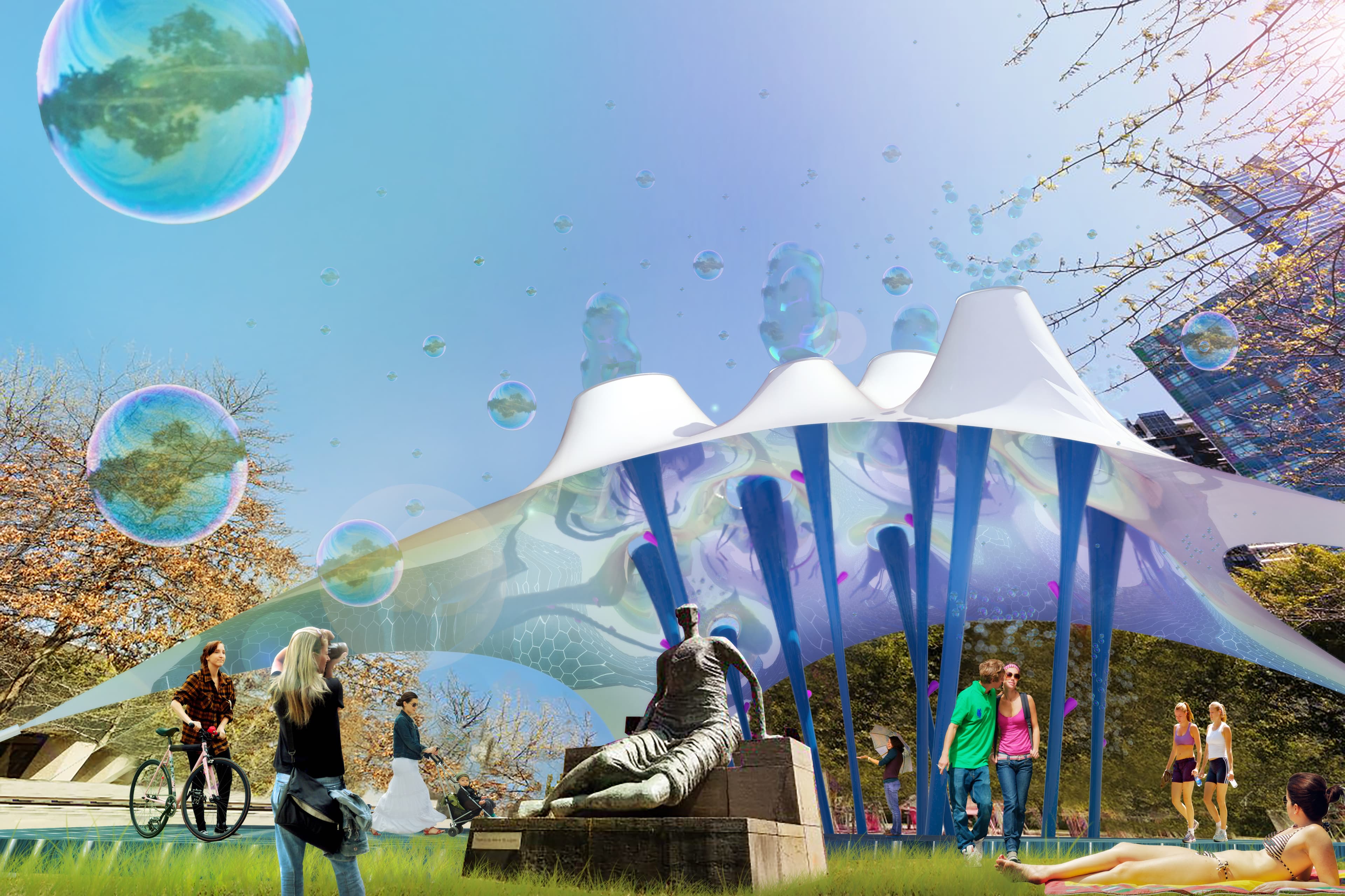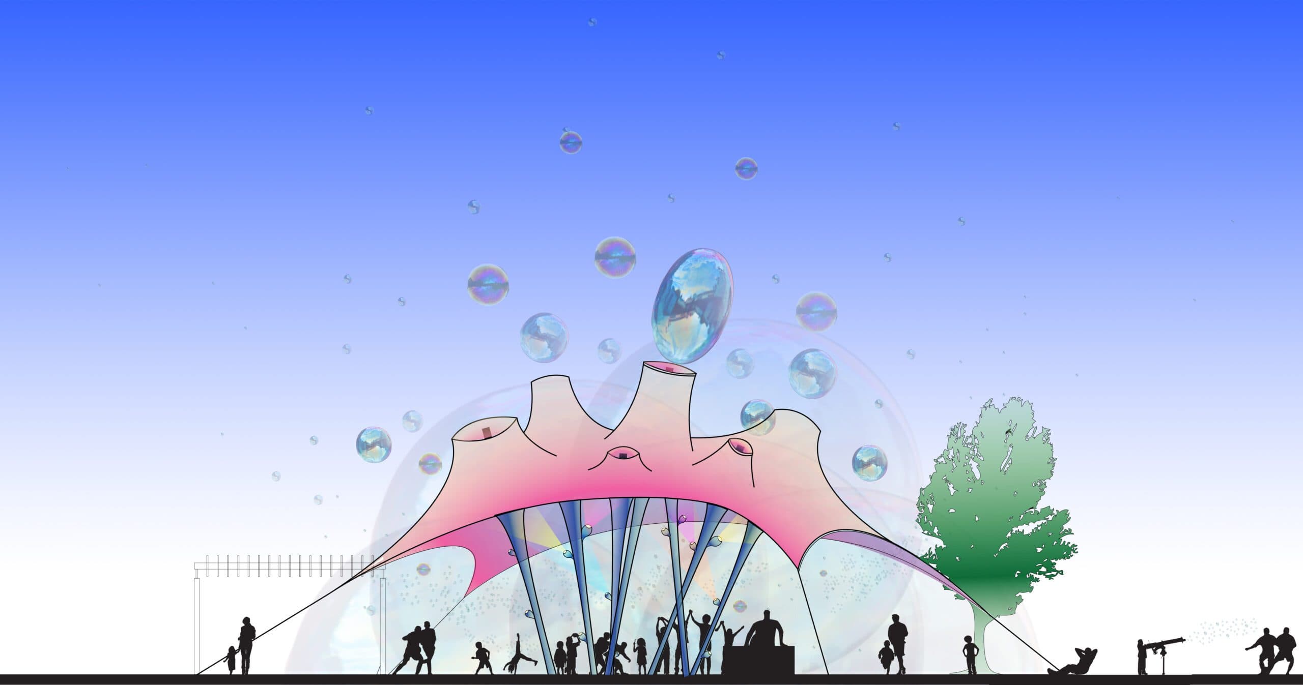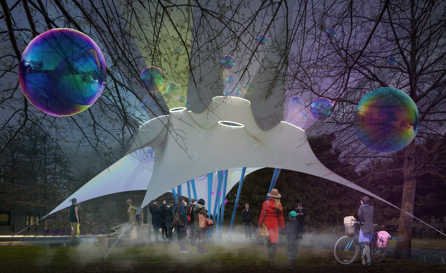 The Playvilion was Decibel’s entry to the NGV Summer Pavilion competition. It is a place of play, joy, shelter and reflection that appeals to a vast demographic of Melbournians who are engaged with the NGV, and more importantly those that are not currently visitors. The Playvilion is founded on a simple premise; how can a space as prosaic as shelter be transformed by the diaphanous and immaterial into a space of wonder. One that is equally capable of making toddlers, teens and the wizened smile at the beauty of physics in motion.