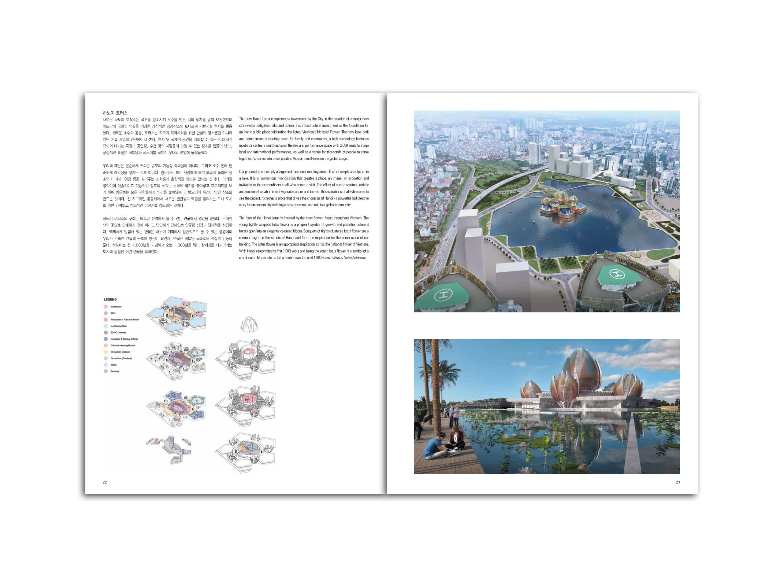 “Hà Nội Lotus mới bổ sung cho khoản đầu tư của Thành phố trong việc tạo ra một hồ giảm thiểu nước mưa lớn mới và sử dụng khoản đầu tư cơ sở hạ tầng này làm nền tảng cho một địa điểm công cộng mang tính biểu tượng tôn vinh Hoa Sen, Quốc hoa của Việt Nam. Hồ, công viên và Bông sen mới tạo nên một nơi gặp gỡ của gia đình và cộng đồng, trung tâm ươm tạo doanh nghiệp công nghệ cao, nhà hát và không gian biểu diễn đa chức năng với 2.000 chỗ ngồi để tổ chức các buổi biểu diễn trong nước và quốc tế, cũng như là nơi hội tụ của hàng nghìn người. Hà Nội trên sân khấu toàn cầu.